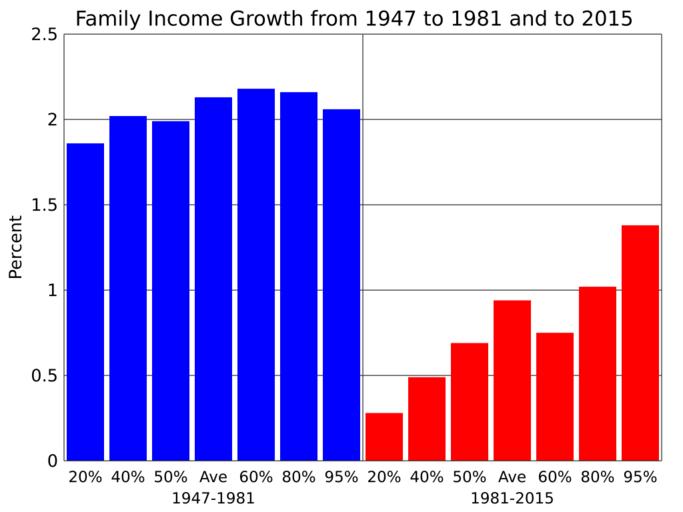 | Keywords: US family income growth from 1947 to 1981 and to 2015.svg  translate yes en From 1947 to 1981 incomes in the United States grew at about 2 per year for all income groups from the bottom 20 to the top 5 but since 1981 average income only grew by 0 9 per year instead of by 2 1 Income for the bottom 20 grew by only 0 3 increasing to 1 4 for the top 5 67 of what it had been Data from US Census https //www census gov/data/tables/time-series/demo/income-poverty/cps-finc/finc-01 html 2016-09-23 own Delphi234 other versions cc-zero Income distribution in the United States |