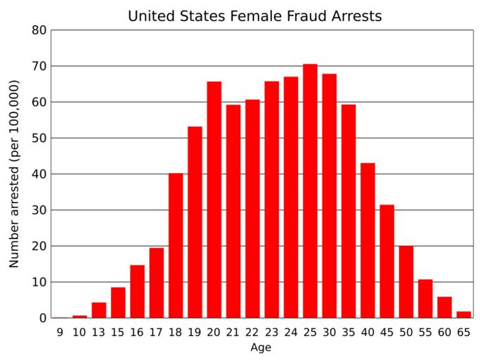 | Keywords: US female arrests for fraud by age.svg translate yes en Arrests in the United States of females for fraud in 2014 by age Data from https //www fbi gov/about-us/cjis/ucr/crime-in-the-u s/2014/crime-in-the-u s -2014/tables/table-40 UCR 2016-05-25 own Delphi234 other versions cc-zero Arrest statistics for the United States SVG bar charts Histograms |