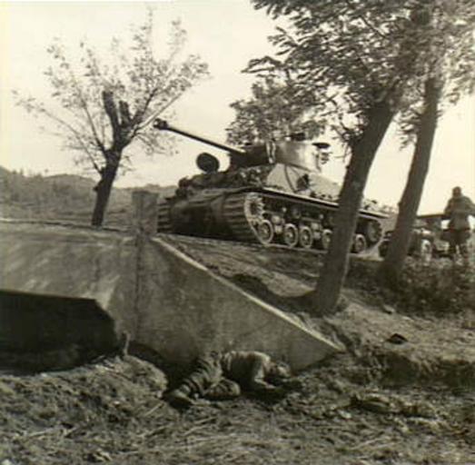 | Keywords: US M4 Sherman tank at Yongju 22 Oct 1950 (AWMP01813).png en Yongju area North Korea 1950-10-22 The dead bodies of two North Korean soldiers lie next to a culvert where they had been killed by members of C Company 3rd Battalion The Royal Australian Regiment 3RAR during the Battle of the Apple Orchard Standing on the road at rear is a US Army Sherman M4A3 medium tank with a jeep behind it P01813 652 Ian Robertson 1950-10-22 Copyright expired - public domain http //cas awm gov au/photograph/P01813 652 PD-AustraliaGov Black and white photographs Korean War forces of Australia 3rd Battalion Royal Australian Regiment Battle of Yongju M4A3E8 tanks M4 tanks during the Korean War |