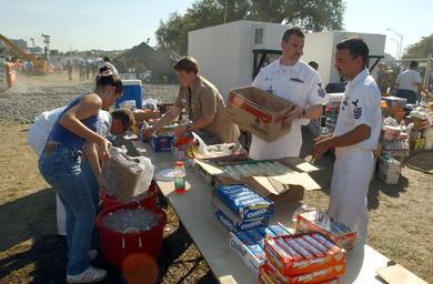 | Keywords: US Navy 010912-N-3235P-005 Military members keep food and beverages stocked.jpg en Arlington Va Sept 12 2001 -- Aerographer's Mate Chief Selectee Robert Pitchi far right and Aerographers Mate Petty Officer 1st Class Paul McKenna center both assigned to the Naval Ice Center stock food and beverages for distribution among the hundreds of rescue workers at the Pentagon Sailors Marines Soldiers and Airmen have been on the scene of the terrorist attack since it occurred on Sep 11 when a hijacked commercial airliner was flown into the southern side of the Pentagon U S Navy photo by Photographer's Mate 1st Class Michael W Pendergrass RELEASED 2001-09-12 010912-N-3235P-005 Navy http //www navy mil/view_image asp id 2450 U S Navy photo by Photographer's Mate 1st Class Michael W Pendergrass PD-USGov-Military-Navy September 2001 photographs Aerographer's Mate People of the United States in 2001 The Pentagon on 12 September 2001 Photographs by Michael W Pendergrass |