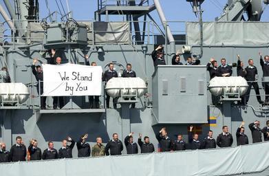 Keywords: US Navy 010913-N-ZZ999-502 Sailors aboard the German navy destroyer FGS Luetjens (D 185) express their condolences to Sailors aboard the guided-mis.jpg en ENGLISH CHANNEL Sept 13 2001 Sailors aboard the German navy destroyer FGS Luetjens D 185 express their condolences to Sailors aboard the guided-missile destroyer USS Winston S Churchill DDG 81 in response to the terrorist attacks in the United States Churchill the Norfolk Va -based destroyer is just finishing Flag Officer Sea Training FOST a comprehensive training program hosted by the Royal Navy U S Navy photo by Photographer's Mate 2nd Class Shane McCoy/Released 2001-09-13 010913-N-ZZ999-502 Navy http //www navy mil/view_image asp id 107231 U S Navy photo by Photographer's Mate 2nd Class Shane McCoy PD-USGov-Military-Navy USS Winston S Churchill DDG-81 September 2001 photographs Photographs by Shane T McCoy |