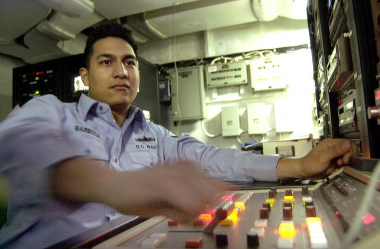 | Keywords: US Navy 011013-N-0685W-001 USS Kitty Hawk (CV 63).jpg  en Aboard USS Kitty Hawk CV 63 Oct 13 2001 -- A Personnelman 3rd class gets ready to switch program monitor feeds while standing the SITE TV-watch in the control room aboard the Kitty Hawk The Kitty Hawk has 4 channels of locally-scheduled programming plus an additional 3 channels of satellite programming which air 24 hours-a-day for the crew Kitty Hawk operates out of Yokosuka Japan as America's only permanently forward deployed aircraft carrier U S Navy Photo by Photographer's Mate Airman Jo Wilbourn RELEASED 2001-10-13 011013-N-0685W-001 Navy http //www navy mil/view_image asp id 1499 U S Navy Photo by Photographer's Mate Airman Jo Wilbourn PD-USGov-Military-Navy Military people in 2001 People of the United States in 2001 October 2001 in the United States Sailors at sea People using computers in the 2000s Photographs of sitting men Aboard USS Kitty Hawk CV-63 Personnelman October 2001 photographs Blue clothing male Male soldiers |