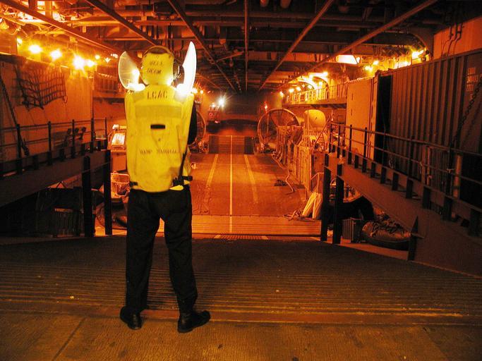 | Keywords: US Navy 020126-N-2383B-515 LCAC arrives aboard LHD-5 well deck.jpg en 020126-N-2383B-515 At sea aboard USS Bataan LHD 5 Jan 26 2002 -- Boatswain's Mate 2nd Class Michael Gladney from St Louis MO directs a Landing Craft Air Cushion LCAC hovercraft from Assault Craft Unit Four ACU-4 into the ship's well deck The LCAC 's are returning U S Marines and equipment from the 26th Marine Expeditionary Unit Special Operations Capable back to ships assigned to Bataan's Amphibious Ready Group ARG Bataan and 26th MEU SOC are conducting missions in support of Operation Enduring Freedom U S Navy photo by Chief Photographer's Mate Johnny Bivera RELEASED 2002-01-26 020126-N-2383B-515 Navy http //www navy mil/view_image asp id 720 U S Navy photo by Chief Photographer's Mate Johnny Bivera PD-USGov-Military-Navy Aboard USS Bataan LHD-5 Well decks Landing Craft Air Cushion |