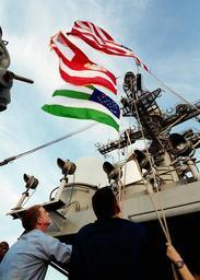 | Keywords: US Navy 020302-N-6626D-003 WTC Flag flown on the last day of Enduring Freedom Operations aboard CVN 71.jpg en 020302-N-6626D-003 At sea aboard USS Theodore Roosevelt CVN 71 March 2 2002 -- The now famous world trade center Ground Zero national ensign along with a New York City Police Department flag and New York City Fire Department flag are flown to commemorate the last day of flight operations in support of Operation Enduring Freedom as she begins her journey home Roosevelt and her embarked carrier air wing CVW are scheduled to be relieved by USS John F Kennedy s carrier battle group U S Navy photo by Photographer s Mate 3rd Class Amy Dela Torres RELEASED 2002-03-02 020302-N-6626D-003 Navy http //www navy mil/view_image asp id 931 U S Navy photo by Photographer s Mate 3rd Class Amy Dela Torres PD-USGov-Military-Navy Aboard USS Theodore Roosevelt CVN-71 Operation Enduring Freedom in 2002 03-02 Photographs of flags of the United States March 2002 photographs 2 March March 2002 in the United States Men at work Military people on duty Male soldiers Military people in 2002 Photographs of flags of New York Sailors at sea Personality rights |
