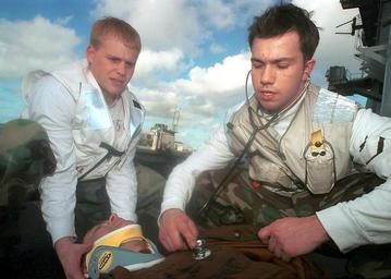 | Keywords: US Navy 020412-N-7871M-001 USS Washington - casualty simulation.jpg en At sea aboard USS George Washington CVN 73 Apr 12 2002 -- Hospital Corpsman 3rd Class Eddie Mota right from Hartford CT and Seaman Brian Holcomb left from Tampa FL work to stabilize an injured Sailor on the flight deck during a simulated casualty drill Washington is homeported in Norfolk VA and is conducting scheduled integrated training exercises in the Atlantic Ocean U S Navy photo by Photographer's Mate Airman Andrew Morrow RELEASED 2002-04-12 020412-N-7871M-001 Navy http //www navy mil/view_image asp id 1265 U S Navy photo by Photographer's Mate Airman Andrew Morrow PD-USGov-Military-Navy Aboard USS George Washington CVN-73 12 April April 2002 photographs April 2002 in the United States Military people in 2002 Military medicine Personality rights |