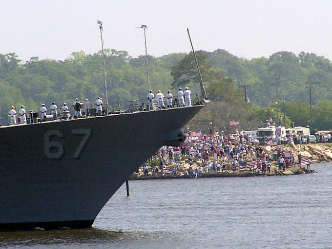 Keywords: US Navy 020419-N-0000B-001 USS Cole leaves Pascagoula, MS.jpg en Northrop Grumman Ship Systems Ingalls Operations Pascagoula MS Apr 19 2002 -- Hundreds of people wave flags and show their support for the guided missile destroyer USS Cole DDG 67 as it leaves Pascagoula MS to return to its homeport in Norfolk VA The Cole has been in Pascagoula for the past 14 months undergoing repairs after a terrorist bomb blew a hole in the port side while refueling in the port city of Aden Yemen on Oct 12 2000 killing 17 sailors U S Navy photo by Stacey Byington RELEASED 2002-04-19 020419-N-0000B-001 Navy http //www navy mil/view_image asp id 1303 U S Navy photo by Stacey Byington PD-USGov-Military-Navy 19 April 2002 in Mississippi April 2002 photographs Aboard USS Cole DDG-67 April 2002 in the United States Crowds in the United States Images related to the USS Cole bombing Naval ships in motion Northrop Grumman Shipbuilding Pascagoula |