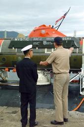 Keywords: US Navy 020423-N-0401E-002 U.S. and Japanese Sailors discuss exercise.jpg en Sasebo Japan Apr 23 2002 -- A naval officer assigned to the U S Navy Los Angeles class attack submarine USS La Jolla SSN 701 explains the capabilities of the deep submergence rescue vehicle Mystic DSRV-1 to a naval officer from the Japanese Maritime Self Defense Force La Jolla and Mystic will operate with surface ships and submarines from the U S Japan Australia the Republic of Korea and the Republic of Singapore during Exercise Pacific Reach Mystic was specifically designed to fill the need for an improved means of rescuing the crew of a submarine immobilized on the ocean floor It can operate independently of surface conditions or under ice for rapid response to an accident anywhere in the world U S Navy photo by Journalist 3rd Class Wes Eplen RELEASED 2002-04-23 020423-N-0401E-002 Navy http //www navy mil/view_image asp id 1361 U S Navy photo by Journalist 3rd Class Wes Eplen PD-USGov-Military-Navy DSRV-1 Mystic submarine 1970 Sasebo Nagasaki USS La Jolla SSN-701 Pacific Reach 2002 April 2002 photographs |