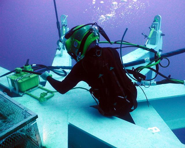 | Keywords: US Navy 020717-N-0331L-004 Monitor salvage and recovery.jpg  en Atlantic Ocean Jul 17 2002 -- Navy diver Hull Maintenance Technician 1st Class Steve Grier works on extending a piece of equipment called the spider which is being used to raise the gun turret of the sunken Civil War ironclad USS Monitor The famed warship sank during a storm Dec 31 1862 off Cape Hatteras N C as she was being towed to Beaufort S C Four officers and 12 men were lost with the ship Monitor was located in 1973 sixteen miles off the Cape by a team of scientists The site was designated as the nation's first marine sanctuary in 1975 U S Navy photo by Photographer s Mate 3rd Class Jeffrey Lehrberg RELEASED 2002-07-17 020717-N-0331L-004 Navy http //www navy mil/view_image asp id 1959 U S Navy photo by Photographer s Mate 3rd Class Jeffrey Lehrberg PD-USGov-Military-Navy Images from US Navy ship USS Monitor The famed warship sank during a storm Dec 31 1862 off Cape Hatteras N C as she was being towed to Beaufort S C Four officers and 12 men were lost with the ship Monitor was located in 1973 sixteen miles off the Cape by a team of scientists The site was designated as the nation's first marine sanctuary in 1975 U S Navy photo by Photographer ™s Mate 3rd Class Jeffrey Lehrberg RELEASED Hull Maintenance Technician United States Navy USS Monitor ship 1862 Underwater archaeology Underwater photographs of surface supplied divers Underwater work |