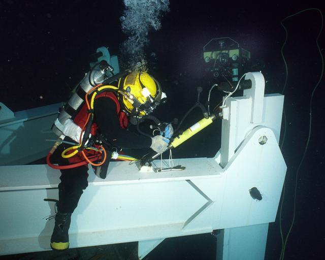 | Keywords: US Navy 020723-N-7479T-002 Navy diver conducts deep sea salvage operations.jpg  en At sea off the coast of Cape Hateras N C July 21 2002 -- Hull Technician 1st Class John Coffelt works on a hydraulic ram as a remote operated vehicle ROV looks on during a dive on the sunken Civil War Ironclad USS Monitor which rests 230 feet below the ocean's surface The ram will be used to articulate a leg of the spider apparatus that will lift the turret U S Navy photo by Chief Photographer s Mate Eric J Tilford RELEASED 2002-07-21 020723-N-7479T-002 Navy http //www navy mil/view_image asp id 2118 U S Navy photo by Chief Photographer s Mate Eric J Tilford PD-USGov-Military-Navy Images from US Navy location Off the coast of Cape Hatteras N C Underwater photographs of surface supplied divers Remotely operated underwater vehicles Hydraulic cylinders USS Monitor ship 1862 Underwater work July 2002 photographs |