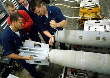 Keywords: US Navy 020807-N-2147L-003 Sailors aboard CVN 73 dismantal a MK-82 bomb in one of the ship's magazines.jpg en At sea aboard USS George Washington CVN 73 Aug 7 2002 -- Airman Roosevelt Hall left from Los Angeles Calif and Aviation Ordnanceman 3rd Class Charles Wisneski from Little Fort N Y remove a bomb stabilizing unit from a Mark 82 500 pound bomb in one of the ship's weapons magazines The Washington battlegroup is on a six-month deployment conducting missions in support of Operation Enduring Freedom U S Navy photo by Photographer's Mate 2nd Class Corey T Lewis RELEASED 2002-08-07 020807-N-2147L-003 Navy http //www navy mil/view_image asp id 2214 U S Navy photo by Photographer's Mate 2nd Class Corey T Lewis PD-USGov-Military-Navy Sailors at sea Aboard USS George Washington CVN-73 Mark 82 bomb August 2002 photographs Military people in 2002 August 2002 in the United States Four men Photographs of standing men Men at work in the United States Military people on duty Personality rights |