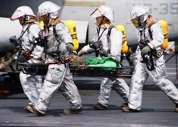 | Keywords: US Navy 030103-N-0119N-001 Crash and Salvage Rescue Team carries an injured sailor on a stretcher during a mass casualty drill.jpg en At sea aboard USS Abraham Lincoln CVN 72 Jan 3 2003 -- The Crash and Salvage Rescue Team carries an injured sailor on a stretcher during a mass casualty drill The proximity suits worn by the Rescue Team protect them from the simulated Class Bravo fuel fire during the exercise Lincoln and her embarked Carrier Air Wing Fourteen CVW-14 are conducting missions in the Western Pacific The Lincoln Battle Group due to return home in late January was notified the deployment has been extended U S Navy photo by Photographer's Mate 3rd Class Jennifer Nichols RELEASED 2003-01-03 030103-N-0119N-001 Navy http //www navy mil/view_image asp id 3925 U S Navy photo by Photographer's Mate 3rd Class Jennifer Nichols PD-USGov-Military-Navy Aboard USS Abraham Lincoln CVN-72 Fire proximity suits January 2003 photographs |