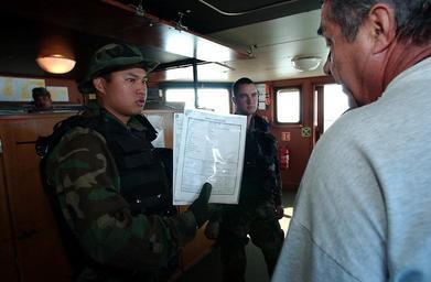 | Keywords: US Navy 030112-N-3642E-004 Fire Controlman 2nd Class Enrico Tatad, assigned to the guided missile cruiser USS Valley Forge (CG 50) asks the captain of a cargo ship if there is an operating copier on board.jpg  en Central Command Area of Responsibility Jan 12 2004 Fire Controlman 2nd Class Enrico Tatad assigned to the guided missile cruiser USS Valley Forge CG 50 asks the captain of a cargo ship if there is an operating copier on board Many documents are copied and brought back to USS Valley Forge for future reference Tatad is conducting a Visit Board Search and Seizure VBSS inspection Valley Forge is currently forward deployed conducting Maritime Interdiction Operations MIOs in the Central Command Area of Responsibility in support of United Nations sanctions against Iraq U S Navy photo by Photographer s Mate 1st Shawn Eklund RELEASED 2004-01-12 030112-N-3642E-004 Navy http //www navy mil/view_image asp id 11944 U S Navy photo by Photographer s Mate 1st Shawn Eklund PD-USGov-Military-Navy Fire Controlman United States Navy images from Central Command USS Valley Forge CG-50 Visit Board Search and Seizure |