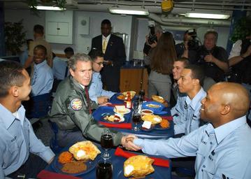 | Keywords: US Navy 030213-N-0874H-004 Presiden Bush has lunch with Sailors aboard USS Philippine Sea.jpg en Aboard USS Philippine Sea CG 58 Feb 13 2002 -- While visiting Naval Station Mayport Fla President George W Bush has lunch with Sailors stationed aboard the guided missile cruiser USS Philippine Sea During a speech earlier in the day President Bush thanked Sailors and their families for their sacrifices and the continuing effort with the global war on terror The United States Navy carries the might and the mission of America to the farthest parts of the world the President said U S Navy Photo by Photographer s Mate 2nd Class Chuck Hill RELEASED 2002-02-13 030213-N-0874H-004 Navy http //www navy mil/view_image asp id 4524 U S Navy Photo by Photographer s Mate 2nd Class Chuck Hill PD-USGov-Military-Navy Aboard USS Philippine Sea CG-58 George W Bush in 2003 Handshakes involving the military |