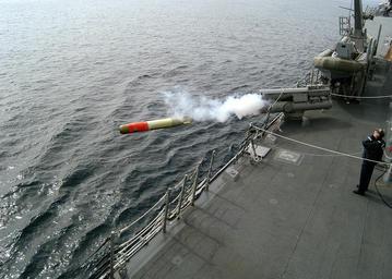 | Keywords: US Navy 030223-N-8029P-002 A MK-46 torpedo launch from USS Preble DDG 88.jpg en Pacific Ocean Feb 23 2003 -- A MK-32 Mod 15 Surface Vessel Torpedo Tube SVTT fires a MK-46 Mod 5 lightweight torpedo from the port side of the recently commissioned guided missile destroyer USS Preble DDG 88 during a Combat Systems Ship Qualification Test CSSQT The MK-46 torpedo is designed to attack high performance submarines and is considered the backbone of the Navy s Anti-Submarine Warfare ASW inventory USS Preble was commissioned Nov 9 2002 and is homeported in San Diego Calif U S Navy photo by Photographer s Mate 3rd Class Ramon Preciado RELEASED 2003-02-23 030223-N-8029P-002 Navy http //www navy mil/view_image asp id 4962 U S Navy photo by Photographer s Mate 3rd Class Ramon Preciado PD-USGov-Military-Navy Mark 46 torpedo Mark 32 Surface Vessel Torpedo Tubes Aboard USS Preble DDG-88 Torpedo launching |