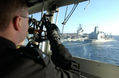 Keywords: US Navy 030226-N-6141B-003 A crew member on the ship^rsquo,s bridge use a sextant style stadimeter-range finder to verify distance between ships during a replenishment at sea operation.jpg en At sea aboard the guided missile cruiser USS Anzio CG 68 Feb 26 2003 -- A crew member on the ship s bridge use a sextant style stadimeter/range finder to verify distance between ships during a replenishment at sea operation Anzio is on a regularly scheduled six-month deployment operating in the Mediterranean Sea in support of Operation Enduring Freedom U S Navy photo by Chief Journalist Alan J Baribeau RELEASED 2003-02-26 030226-N-6141B-003 Navy http //www navy mil/view_image asp id 4793 U S Navy photo by Chief Journalist Alan J Baribeau PD-USGov-Military-Navy Aboard USS Anzio CG-68 Stadimeters Coming alongside underway replenishment Navigation underway replenishment |