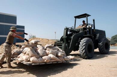 | Keywords: US Navy 030310-N-5362A-005 A U.S. Navy Seabee attached to Amphibious Construction Battalion One (ACB-1) loads sand bags onto a forklift.jpg en Camp Patriot Kuwait Mar 10 2003 -- A U S Navy Seabee attached to Amphibious Construction Battalion One ACB-1 loads sand bags onto a forklift during efforts to build sand bunkers to fortify various locations throughout Camp Patriot Navy Seabees from Amphibious Construction Battalion One are currently forward deployed in support of Operation Enduring Freedom U S Navy photo by Photographer's Mate 1st Class Arlo K Abrahamson RELEASED 2003-03-10 030310-N-5362A-005 Navy http //www navy mil/view_image asp id 5124 U S Navy photo by Photographer's Mate 1st Class Arlo K Abrahamson PD-USGov-Military-Navy Camp Patriot Amphibious Construction Battalion 1 Military loaders Military life |