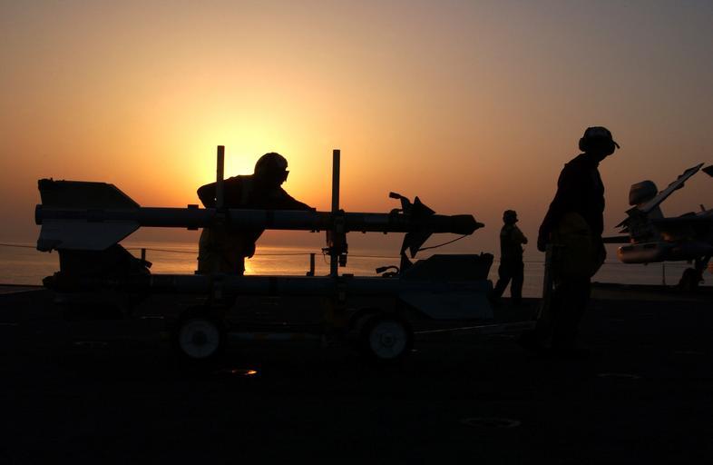 Keywords: US Navy 030317-N-1810F-008 Aviation Ordnancemen move AIM-9M Sidewinder air-to-air missile to aircraft on the ship^rsquo,s flight deck.jpg en The Arabian Gulf Mar 17 2003 -- Aviation Ordnancemen move AIM-9M Sidewinder air-to-air missile to aircraft on the ship s flight deck aboard USS Kitty Hawk CV 63 The Sidewinder is a short-range heat seeking air-intercept missile used by 28 different nations including the United States Kitty Hawk and her embarked Carrier Air Wing Five CVW-5 are conducting missions in support of Operations Southern Watch and Enduring Freedom Kitty Hawk is the Navy s only permanently forward-deployed aircraft carrier and operates out of Yokosuka Japan U S Navy photo by Photographer's Mate 3rd Class Todd Frantom RELEASED 2003-03-17 030317-N-1810F-008 Navy http //www navy mil/view_image asp id 5365 U S Navy photo by Photographer's Mate 3rd Class Todd Frantom PD-USGov-Military-Navy AIM-9 Sidewinder Aboard USS Kitty Hawk CV-63 Pictures by Mass Communication Specialist Todd Frantom Aviation Ordnanceman Silhouettes of men |