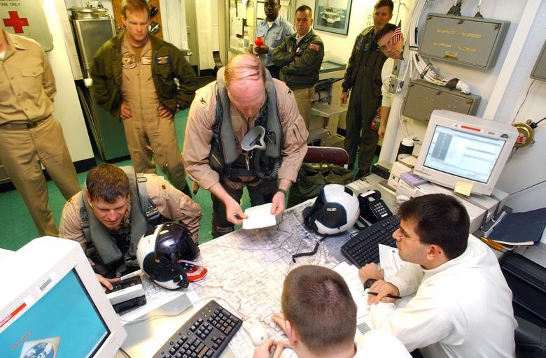 Keywords: US Navy 030320-N-3235P-515 Minutes after landing their F-14B Tomcat the flight crew reviews footage from the aircraft^rsquo,s LANTIRN Targeting Pod system during the post mission debrief in the Carrier Intelligence Center (CVI.jpg en Mediterranean Sea Mar 20 2003 -- Minutes after landing their F-14B Tomcat the flight crew reviews footage from the aircraft s LANTIRN Targeting Pod system during the post mission debrief in the Carrier Intelligence Center CVIC aboard USS Harry S Truman CVN 75 LANTIRN consists of a navigation pod and a targeting pod integrated and mounted externally beneath the aircraft and it significantly increases the combat effectiveness of these aircraft allowing them to fly at low altitudes at night and under-the-weather to attack ground targets with a variety of precision-guided and unguided weapons Truman and her embarked Carrier Air Wing Three CVW-3 are conducting combat missions in support of Operation Iraqi Freedom Operation Iraqi Freedom is the multinational coalition effort to liberate the Iraqi people eliminate Iraq s weapons of mass destruction and end the regime of Saddam Hussein U S Navy photo by Photographer's Mate 1st Class Michael W Pendergrass RELEASED 2003-03-20 030320-N-3235P-515 Navy http //www navy mil/view_image asp id 5547 U S Navy photo by Photographer's Mate 1st Class Michael W Pendergrass PD-USGov-Military-Navy Aboard USS Harry S Truman CVN-75 Fighter Squadron 32 United States Navy Photographs by Michael W Pendergrass |