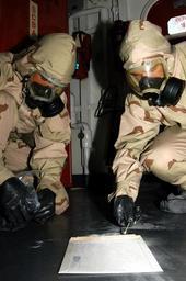 | Keywords: US Navy 030323-N-9403F-045 Hull Technician Fireman Michael L. McLain assists Damage Controlman 3rd Class Joseph Pierce during a Chemical, Biological, and Radiological (CBR) drill aboard USS Abraham Lincoln (CVN 72).jpg en The Arabian Gulf Mar 23 2003 -- Hull Technician Fireman Michael L McLain assists Damage Controlman 3rd Class Joseph Pierce during a Chemical Biological and Radiological CBR drill aboard USS Abraham Lincoln CVN 72 in sampling a suspiscious substance 'found in the mail' using a bio-hazard sampling kit Lincoln is deployed in support of Operation Iraqi Freedom the multi-national coalition effort to liberate the Iraqi people eliminate Iraq's weapons of mass destruction and end the regime of Saddam Hussein U S Navy photo by Photographer's Mate Airman Jason Frost RELEASED 2003-03-23 030323-N-9403F-045 Navy http //www navy mil/view_image asp id 5633 U S Navy photo by Photographer's Mate Airman Jason Frost PD-USGov-Military-Navy Damage Controlman Aboard USS Abraham Lincoln CVN-72 |