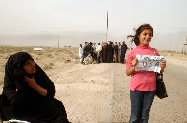 | Keywords: US Navy 030409-N-4309A-008 A local Iraqi girl shows her enthusiasm for the United States of America (USA) being in Iraq, with a homemade sign.jpg en Central Command Area of Responsibility Apr 9 2003 -- A local Iraqi girl shows her enthusiasm for the United States of America USA being in Iraq with a homemade sign Her family waits to find if one of their relatives is among the thousands of Enemy Prisoners of War EPW held in a nearby EPW camp captured during Operation Iraqi Freedom Operation Iraqi Freedom is the multinational coalition effort to liberate the Iraqi people eliminate Iraq's weapons of mass destruction and end the regime of Saddam Hussein U S Navy photo by Photographer's Mate 1st Class Aaron Ansarov RELEASED 2003-04-09 030409-N-4309A-008 Navy http //www navy mil/view_image asp id 6593 U S Navy photo by Photographer's Mate 1st Class Aaron Ansarov PD-USGov-Military-Navy United States Navy images from Central Command |