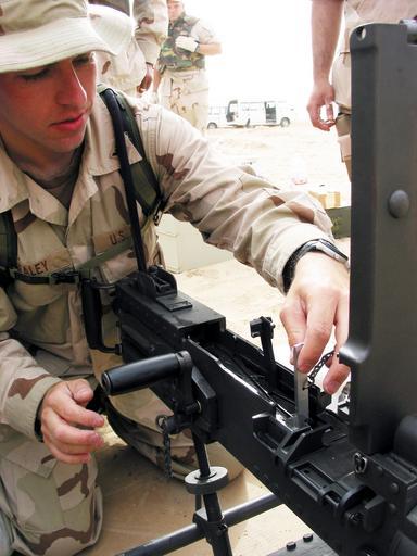 | Keywords: US Navy 030412-N-1050K-014 Gunner's Mate 3rd Class Jeff Healey, 23, from Albuquerque, N.M., tests the barrel alignment of the M2 .50 caliber machine gun.jpg en Camp Patriot Kuwait Apr 12 2003 -- Gunner's Mate 3rd Class Jeff Healey 33 from Albuquerque N M tests the barrel alignment of the M2 50 caliber machine gun with the 'go-no go' key during a recent joint live fire exercise here Healey and others attached to Mobile Inshore Undersea Warfare Unit One Zero Nine MIUW-109 homeported in Fort Worth Texas described the specifics of the M2 to 20 Kuwaiti security force personnel during a joint nation crew serve weapons familiarization training fire MIUWU-109 is one of the key all-reserve units attached to Naval Coastal Warfare Group One NCWG-1 forward deployed to handle force protection responsibilities at Camp Patriot Camp Patriot is home to nearly 3 000 active duty and reserve Sailors Soldiers Marines Airmen and Coast Guardsmen forward deployed in support of Operation Iraqi Freedom Operation Iraqi Freedom is the multi-national coalition effort to liberate the Iraqi people eliminate Iraq s weapons of mass destruction and end the regime of Saddam Hussein U S Navy photo by Journalist 1st Class Joseph Krypel RELEASED 2003-04-12 030412-N-1050K-014 Navy http //www navy mil/view_image asp id 6631 U S Navy photo by Journalist 1st Class Joseph Krypel PD-USGov-Military-Navy Camp Patriot Browning M2 of the US Navy Gunner's Mate Mobile Inshore Undersea Warfare Unit 109 |