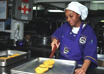 Keywords: US Navy 030418-N-9741A-007 Mess Management Specialist 3rd Class Stacey Davis from New York, N.Y. moves chicken patties from the baking pan to a serving dish.jpg en Philippine Sea Apr 18 2003 -- Mess Management Specialist 3rd Class Stacey Davis from New York N Y moves chicken patties from the baking pan to a serving dish in preparation for the evening meal aboard USS Blue Ridge LCC 19 U S Navy photo by Photographer s Mate Airman Kerri Lynn Ackman RELEASED 2003-04-18 030418-N-9741A-007 Navy http //www navy mil/view_image asp id 6804 U S Navy photo by Photographer s Mate Airman Kerri Lynn Ackman PD-USGov-Military-Navy Aboard USS Blue Ridge LCC-19 Chicken cooking |