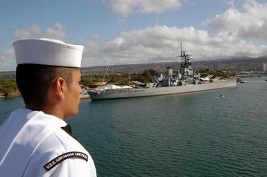 Keywords: US Navy 030426-N-9228K-084 A Sailor aboard USS Abraham Lincoln (CVN 72) prepares to render honors to USS Missouri (BB 63) while manning the rails during their recent port visit to Pearl Harbor.jpg en Pearl Harbor Hawaii Apr 26 2003 -- A Sailor aboard USS Abraham Lincoln CVN 72 prepares to render honors to USS Missouri BB 63 while manning the rails during their recent port visit to Pearl Harbor Lincoln and Carrier Air Wing Fourteen CVW-14 are returning home from their deployment of nearly 10 months at sea in support of Operation Iraqi Freedom Operation Iraqi Freedom is the multi-national coalition effort to liberate the Iraqi people eliminate Iraq s weapons of mass destruction and end the regime of Saddam Hussein U S Navy photo by Photographer's Mate 3rd Class Michael S Kelly RELEASED 2003-04-26 030426-N-9228K-084 Navy http //www navy mil/view_image asp id 7058 U S Navy photo by Photographer's Mate 3rd Class Michael S Kelly PD-USGov-Military-Navy Battleship Missouri Memorial Manning the rail in the United States Navy Sailor caps of the United States Navy |