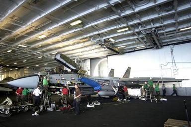 Keywords: US Navy 030428-N-4308O-006 Sailors assigned to the Swordsman of Fighter Squadron Thirty Two (VF-32) perform maintenance to an F-14 Tomcat in the hangar bay after it had broken the sound barrier during an air power demonstration.jpg en The Mediterranean Sea Apr 28 2003 -- Sailors assigned to the Swordsman of Fighter Squadron Thirty Two VF-32 perform maintenance to an F-14 Tomcat in the hangar bay after it had broken the sound barrier during an air power demonstration USS Harry S Truman CVN 75 and Carrier Air Wing Three CVW-3 are on deployment conducting missions in support of Operation Iraqi Freedom Operation Iraqi Freedom is the multi-national coalition effort to liberate the Iraqi people eliminate Iraq's weapons of mass destruction and end the regime of Saddam Hussein U S Navy photo by Photographer's Mate Airman Ryan O'Connor RELEASED 2003-04-28 030428-N-4308O-006 Navy http //www navy mil/view_image asp id 7120 U S Navy photo by Photographer's Mate Airman Ryan O'Connor PD-USGov-Military-Navy F-14B Tomcat F-14 Tomcat maintenance Aboard USS Harry S Truman CVN-75 Fighter Squadron 32 United States Navy |