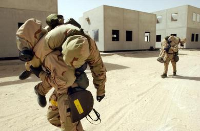 | Keywords: US Navy 030520-N-4309A-046 Members of Naval Support Activity (NSA) Bahrain's Emergency Response Team participate in an improvised carry.jpg  en Naval Support Activity NSA Bahrain May 20 2003 -- Members of Naval Support Activity NSA Bahrain's Emergency Response Team participate in an improvised carry which is one of the various ways of evacuating wounded personnel The NSA Bahrain Emergency Response Team recently met at a remote training facility to practice their skills on Chemical Biological Radiological defense response and recovery procedures U S Navy photo by Photographer s Mate 1st Class Aaron Ansarov RELEASED 030520-N-4309A-046 Navy http //www navy mil/view_image asp id 7627 U S Navy photo by Photographer s Mate 1st Class Aaron Ansarov PD-USGov-Military-Navy Naval Support Activity Bahrain Military protective clothing Military training in the United States Fireman's carry MCU-2/P Protective Mask Males wearing gas masks |