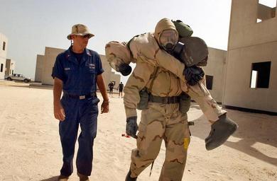 | Keywords: US Navy 030520-N-4309A-048 Boatswain^rsquo,s Mate 1st Class Kenneth Feagin instructs members of Naval Support Activity (NSA) Bahrain's Emergency Response Team.jpg  en Naval Support Activity NSA Bahrain May 20 2003 -- Boatswain s Mate 1st Class Kenneth Feagin instructs members of Naval Support Activity NSA Bahrain's Emergency Response Team on one of various ways to evacuate wounded personnel using the improvised carry The NSA Bahrain Emergency Response Team recently met at a remote training facility to practice their skills on Chemical Biological Radiological defense response and recovery procedures U S Navy photo by Photographer s Mate 1st Class Aaron Ansarov RELEASED 030520-N-4309A-048 Navy http //www navy mil/view_image asp id 7629 U S Navy photo by Photographer s Mate 1st Class Aaron Ansarov PD-USGov-Military-Navy Naval Support Activity Bahrain Military training in the United States Military protective clothing Fireman's carry Rescue training MCU-2/P Protective Mask Males wearing gas masks |