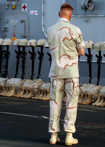 Keywords: US Navy 030526-N-4048T-009 Brig. Gen. Richard F. Natonski, Commanding General 2D Marine Expeditionary Brigade pauses for a moment of reflection before the beginning of a special Memorial Day Service to honor 23 Marines assigned.jpg en At sea aboard the amphibious assault ship USS Kearsarge LHD 3 May 26 2003 -- Brig Gen Richard F Natonski Commanding General 2D Marine Expeditionary Brigade/Deputy Commanding General II Marine Expeditionary Force pauses for a moment of reflection before the beginning of a special Memorial Day Service to honor 23 Marines assigned to 2d Marine Expeditionary Brigade 2d MEB who paid the ultimate sacrifice during combat missions in support of Operation Iraqi Freedom More than 1 000 Sailors and Marines were present during the ceremony held on the ship s flight deck Kearsarge is currently returning home after deploying January 12 2003 and is expected to arrive at her homeport in Norfolk Va in late June U S Navy photo by Photographer s Mate 2nd Class Alicia Tasz RELEASED 2003-05-26 030526-N-4048T-009 Navy http //www navy mil/view_image asp id 7619 U S Navy photo by Photographer s Mate 2nd Class Alicia Tasz PD-USGov-Military-Navy Aboard USS Kearsarge LHD-3 M16 rifle Soldier's Cross Richard F Natonski |