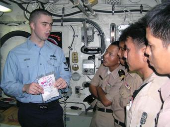 | Keywords: US Navy 030608-N-3160B-002 Damage Controlman 2nd Class Nathan Snyder shows Royal Thai Navy members an emergency water activated repair patch (EWARP) during a familiarization tour of the amphibious dock landing ship USS Harpers.jpg en Sattahip Thailand Jun 8 2003 -- Damage Controlman 2nd Class Nathan Snyder shows Royal Thai Navy members an emergency water activated repair patch EWARP during a familiarization tour of the amphibious dock landing ship USS Harpers Ferry LSD 49 The tour was part of the Thailand phase of exercise Cooperation Afloat Readiness and Training CARAT CARAT is a regularly scheduled series of bilateral military training exercises between the U S and several Association of Southeast Asian Nations ASEAN U S Navy photo by Journalist 3rd Class Alicia T Boatwright RELEASED 2003-06-08 030608-N-3160B-002 Navy http //www navy mil/view_image asp id 7983 U S Navy photo by Journalist 3rd Class Alicia T Boatwright PD-USGov-Military-Navy Damage Controlman Images from US Navy location Sattahip Thailand Aboard USS Harpers Ferry LSD-49 |