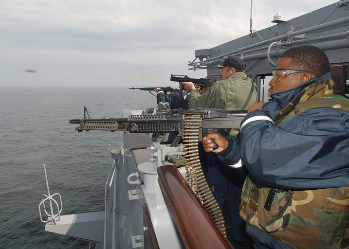 | Keywords: US Navy 030611-N-4374S-003 Crewmembers assigned to the Aegis-class cruiser USS Vella Gulf (CG 72) conduct a small arms fire exercise during the annual maritime exercise Baltic Operations 2003 (BALTOPS 2003).jpg en Baltic Sea Jun 11 2003 -- Crewmembers assigned to the Ticonderoga class cruiser USS Vella Gulf CG 72 conduct a small arms exercise during the annual maritime exercise Baltic Operations 2003 BALTOPS 2003 The United States and 12 other nations are participating in this year's exercise BALTOPS 2003 is intended to improve interoperability between allies and Partnership for Peace countries by conducting a peace support operation at sea including exercises in gunnery replenishment-at-sea undersea warfare radar tracking mine countermeasures seamanship search and rescue maritime interdiction operations and scenarios dealing with potentially real world crises U S Navy photo by Photographer s Mate 2nd Class Michael Sandberg RELEASED 2003-06-11 030611-N-4374S-003 Navy http //www navy mil/view_image asp id 8018 U S Navy photo by Photographer s Mate 2nd Class Michael Sandberg PD-USGov-Military-Navy BALTOPS 2003 M60 machine gun Aboard USS Vella Gulf CG-72 |