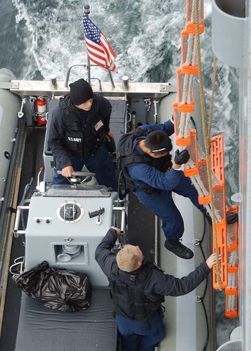 | Keywords: US Navy 030612-N-4374S-004 A member of the Vessel Boarding Search and Seizure (VBSS) team from the Aegis class, guided missile cruiser USS Vella Gulf (CG 72) boards a rigid hull inflatable boat (RHIB).jpg en Baltic Sea Jun 12 2003 -- A member of the Vessel Boarding Search and Seizure VBSS team from the Ticonderoga class guided missile cruiser USS Vella Gulf CG 72 boards a rigid hull inflatable boat RHIB that is preparing to conduct a training exercise with the German Bremen class frigate FGS Lubeck F 214 during the annual maritime exercise Baltic Operations 2003 BALTOPS The United States and 12 other nations are participating in this year's exercise BALTOPS 2003 is intended to improve interoperability between allies and Partnership for Peace countries by conducting at sea undersea warfare radar tracking mine countermeasures seamanship search and rescue maritime interdiction operations and scenarios dealing with potentially real world crises U S Navy photo by Photographer s Mate 2nd Class Michael Sandberg RELEASED 2003-06-12 030612-N-4374S-004 Navy http //www navy mil/view_image asp id 8146 U S Navy photo by Photographer s Mate 2nd Class Michael Sandberg PD-USGov-Military-Navy Aboard USS Vella Gulf CG-72 BALTOPS 2003 Rigid-hulled inflatable boats of US Navy |