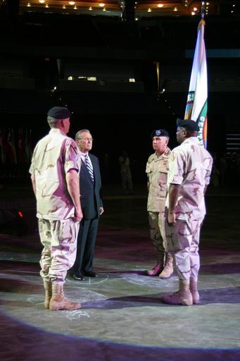 Keywords: US Navy 030707-N-5891B-006 U.S. Central Command (CENTCOM) Sgt. Maj. Dwight Brown (right) prepares to pass the command flag to U.S. Army Gen. Tommy R. Franks, (left) during the CENTCOM change of command ceremony.jpg en Tampa Fla Jul 7 2003 -- U S Central Command CENTCOM Sgt Maj Dwight Brown right prepares to pass the command flag to U S Army Gen Tommy R Franks left during the CENTCOM change of command ceremony Gen Franks will then pass the flag to the Honorable Donald Rumsfeld Secretary of Defense center-left who will then pass the flag to the new CENTCOM Commander Gen John P Abizaid center-right symbolizing the official transfer of duties to Gen Abizaid Gen Franks will step down after 38 years of military service CENTCOM covers the 25 countries of the Middle East Central Asia and Horn of Africa The area is larger than the continental United States and stretches 3 600 miles to the east and west and 4 600 miles to the north and south U S Navy photo by Petty Officer 1st Class Gary P Bonaccorso RELEASED 2003-07-07 030707-N-5891B-006 Navy http //www navy mil/view_image asp id 8420 U S Navy photo by Petty Officer 1st Class Gary P Bonaccorso PD-USGov-Military-Navy Images from US Navy location TAMPA Fla Tommy Franks Donald Rumsfeld in 2003 John Abizaid Change of command July 2003 in the United States 2003 in Tampa |