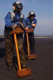 | Keywords: US Navy 030716-N-4953E-019 Airmen Austin Sanders and Daniel Moore stand by awaiting a T-2C Buckeye assigned to Fixed Wing Training Squadron Nine (VT-9) to land on the flight deck of USS Harry S. Truman (CVN 75).jpg  en Aboard USS Harry S Truman CVN 75 Jul 16 2003 -- Airmen Austin Sanders and Daniel Moore stand by awaiting a T-2C Buckeye assigned to Fixed Wing Training Squadron Nine VT-9 to land on the flight deck of USS Harry S Truman CVN 75 This is the last time the T-2C Buckeye will be used to train student pilots aboard aircraft carriers Truman is conducting Carrier Qualifications CQ and an ammo off load on the Eastern seaboard of the United States U S Navy photo by Photographer's Mate 2nd Class Danny Ewing Jr RELEASED 030716-N-4953E-019 Navy http //www navy mil/view_image asp id 8623 U S Navy photo by Photographer's Mate 2nd Class Danny Ewing Jr PD-USGov-Military-Navy Aboard USS Harry S Truman CVN-75 Wheel chocks Training Squadron 9 United States Navy Photographs by Danny Ewing Jr |