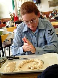 Keywords: US Navy 030717-N-5821W-001 Mess Management Specialist 3rd Class Crystal Kaiser rolls a small bit of dough in her hands to create a grape for her dough creation during a two-week Culinary Arts course.jpg en Naval Air Station NAS Sigonella Sicily Jul 17 2003 -- Mess Management Specialist 3rd Class Crystal Kaiser rolls a small bit of dough in her hands to create a grape for her dough creation during a two-week Culinary Arts course held at the NAS Sigonella Galley Instructors from the First Coast Technical Institute School of Culinary Arts in Saint Augustine Fla taught the Mess Management Specialists the intricacies of culinary arts and gave certificate courses in sanitation and nutrition NAS Sigonella provides logistical support for Sixth Fleet and NATO forces in the Mediterranean Sea U S Navy photo by Journalist Seaman Stephen P Weaver RELEASED 030717-N-5821W-001 Navy http //www navy mil/view_image asp id 8672 U S Navy photo by Journalist Seaman Stephen P Weaver PD-USGov-Military-Navy Naval Air Station Sigonella Baking |