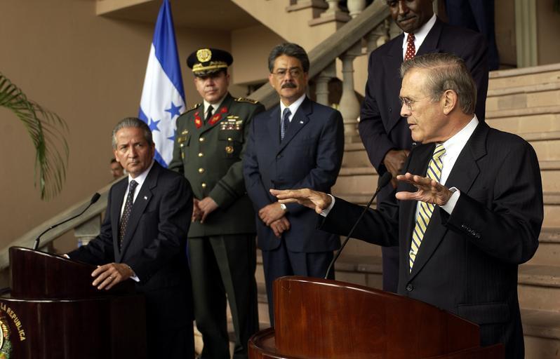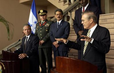 | Keywords: US Navy 030820-F-2828D-168 Secretary of Defense Donald H. Rumsfeld (right) answers a question from the media during a joint press conference with Honduran President Ricardo Maduro.jpg  en Tegucigalpa Honduras Aug 20 2003 -- Secretary of Defense Donald H Rumsfeld right answers a question from the media during a joint press conference with Honduran President Ricardo Maduro left at the Presidential House in Tegucigalpa Honduras Rumsfeld is in Honduras to meet with Maduro and to thank the Honduran government for sending troops to Iraq in support of the coalition forces U S Air Force photo by Tech Sgt Andy Dunaway RELEASED 2003-08-20 030820-F-2828D-168 Navy http //www navy mil/view_image asp id 9137 U S Navy photo PD-USGov-Military-Navy Images from US Navy location Tegucigalpa Honduras Ricardo Maduro Donald Rumsfeld in 2003 |