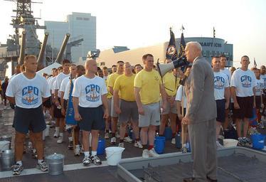 Keywords: US Navy 030820-N-9809D-002 Former Master Chief of the Navy (MCPON) Robert Walker addresses 2003 Chief Petty Officer selectees during morning quarters on the fantail of USS Wisconsin (BB 64).jpg en Norfolk Va Aug 20 2003 -- Former Master Chief of the Navy MCPON Robert Walker addresses 2003 Chief Petty Officer selectees during morning quarters on the fantail of USS Wisconsin BB 64 Wisconsin is part of a museum in downtown Norfolk Va More than 200 CPO selectees were aboard to help preserve the battleship by cleaning the teak wood deck U S Navy photo by Senior Chief Photographer's Mate Joseph Dorey RELEASED 2003-08-20 030820-N-9809D-002 Navy http //www navy mil/view_image asp id 9151 U S Navy photo by Senior Chief Photographer's Mate Joseph Dorey PD-USGov-Military-Navy Battleship Wisconsin museum ship Robert Walker USN People with hand-held megaphones |