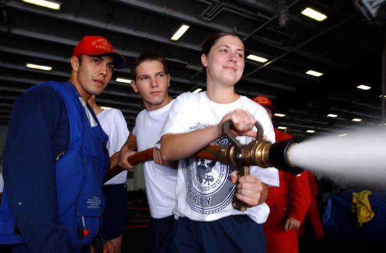 Keywords: US Navy 031004-N-4768W-082 Midshipman Melissa Lucas, from San Diego State University receives fire fighting training from Damage Controlman 3rd Class Mike Vega aboard USS John C. Stennis (CVN 74).jpg en Pacific Ocean Oct 4 2003 -- Midshipman Melissa Lucas from San Diego State University receives fire fighting training from Damage Controlman 3rd Class Mike Vega aboard USS John C Stennis CVN 74 Stennis is at sea in the Southern California operating area U S Navy photo by Photographer's Mate 3rd Class Joshua Word RELEASED 2003-10-04 031004-N-4768W-082 Navy http //www navy mil/view_image asp id 9966 U S Navy photo by Photographer's Mate 3rd Class Joshua Word PD-USGov-Military-Navy Guests aboard USS John C Stennis CVN-74 San Diego State University |