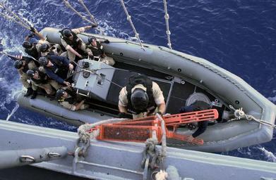 | Keywords: US Navy 031014-N-1056B-010 A boarding team assigned to USS Nicholas (FFG 47) departs to board and inspect the French Frigate FS Jacouvet (F 754).jpg en Aboard USS Nicholas FFG 47 Oct 14 2003 -- A boarding team assigned to USS Nicholas FFG 47 departs to board and inspect the French Frigate FS Jacouvet F 754 Nicholas is participating in the Spanish-led SANSO 2003 phase of the Proliferation Security Exercise with armed forces from eleven countries The ten-phase exercise is a maritime interdiction operations training exercise which targets vessels simulating merchant vessels suspected of carrying weapons of mass destruction and their related delivery devices U S Navy photo by Lt Corey Barker RELEASED 2003-10-14 031014-N-1056B-010 Navy http //www navy mil/view_image asp id 10016 U S Navy photo by Lt Corey Barker PD-USGov-Military-Navy USS Nicholas FFG-47 Rigid-hulled inflatable boats |