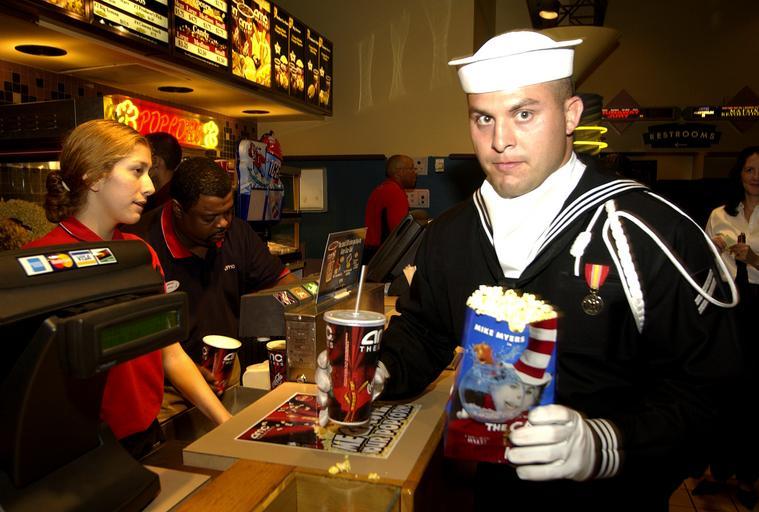 | Keywords: US Navy 031106-N-9693M-001 Seaman Apprentice Chris Firking carries popcorn and soda into a theater.jpg en Arlington Va Nov 6 2003 -- Seaman Apprentice Chris Firking from Del City Okla carries popcorn and soda into a theater to watch the premier of the short film Operation Iraqi Freedom Chapter II and a special Department of the Navy screening of the full-length film Master and Commander The Far Side of the World Firking a ceremonial guardsman was part of a special detail assigned to help with the event Approximately 375 people attended the show including The Honorable Gordon R England Secretary of the Navy Operation Iraqi Freedom Chapter II will be shown at base theaters and other broadcast venues U S Navy photo by Damon J Moritz RELEASED 2003-11-06 031106-N-9693M-001 Navy http //www navy mil/view_image asp id 10464 U S Navy photo by Damon J Moritz PD-USGov-Military-Navy Master and Commander The Far Side of the World Arlington County Virginia Popcorn |