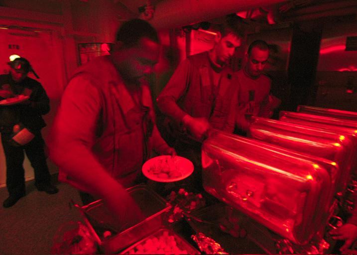 | Keywords: US Navy 031127-N-9742R-001 Flight deck personnel help themselves to a Thanksgiving dinner aboard USS Enterprise.jpg en Arabian Gulf Nov 27 2003 -- Flight deck personnel help themselves to a Thanksgiving dinner aboard USS Enterprise CVN 65 served by Mess Management Specialists under dim red lights within the aircraft carrier's island superstructure During night flight operations red lights help conserve the night vision of flight deck personnel U S Navy photo by Photographer's Mate Airman Milosz Reterski RELEASED 2003-11-27 031127-N-9742R-001 Navy http //www navy mil/view_image asp id 10848 U S Navy photo by Photographer's Mate Airman Milosz Reterski PD-USGov-Military-Navy Aboard USS Enterprise CVN-65 Thanksgiving food Red Military activities at night Thanksgiving in the Military of the United States Thanksgiving 2003 November 2003 2003 in water transport People of the United States in 2003 Photographs taken on 2003-11-27 Thanksgiving onboard watercraft |