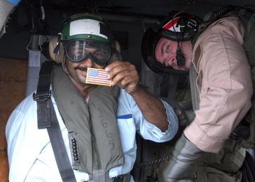 | Keywords: US Navy 040104-N-5405H-006 Iraqi merchant seaman Atif Youssifin displays a souvenir American flag patch received during his stay aboard USS Enterprise (CVN 65).jpg en Arabian Gulf Jan 4 2004 -- Iraqi merchant seaman Atif Youssifin displays a souvenir American flag patch received during his stay aboard USS Enterprise CVN 65 while Senior Chief Aviation Warfare Systems Operator Jim Zobrosky fastens him into his seat in preparation for departure via helicopter from the Norfolk Va based nuclear-powered aircraft carrier USS Enterprise CVN 65 Mr Atif Youssifin was flown from his vessel to Enterprise for a medical emergency and was treated by medical staff aboard the ship The Enterprise Carrier Strike Group CSG is currently deployed conducting missions in support of Operation Iraqi Freedom and the continued war on terrorism U S Navy photo by Photographer's Mate Airman Joshua E Helgeson RELEASED 2004-01-04 040104-N-5405H-006 Navy http //www navy mil/view_image asp id 11267 U S Navy photo by Photographer's Mate Airman Joshua E Helgeson PD-USGov-Military-Navy Aboard USS Enterprise CVN-65 |