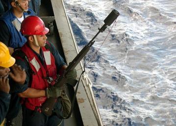Keywords: US Navy 040130-N-1525C-002 Gunner^rsquo,s Mate 2nd Class Frederic N. Thomas from San Antonio, Texas, stands by to fire a shot line.jpg en Aboard USS Boxer LHD 4 Jan 30 2004 Gunner s Mate 2nd Class Frederic N Thomas from San Antonio Texas stands by to fire a shot line from the amphibious assault ship USS Boxer LHD 4 during a recent connected replenishment CONREP with the military sealift command ship USNS San Jose T-AFS 7 After returning from a regular deployment in July 2003 Boxer departed for the Arabian Gulf to support the rotation of forces involved in Operation Iraqi Freedom The multipurpose amphibious assault ship is transporting support equipment and aviation assets for the 1st Marine Expeditionary Force 1st MEF stationed at Camp Pendleton Calif U S Navy photo by Chief Journalist J L Chirrick RELEASED 2004-01-30 040130-N-1525C-002 Navy http //www navy mil/view_image asp id 11765 U S Navy photo by Chief Journalist J L Chirrick PD-USGov-Military-Navy Aboard USS Boxer LHD-4 Gunner's Mate underway replenishment M14 rifle fireing shot line |