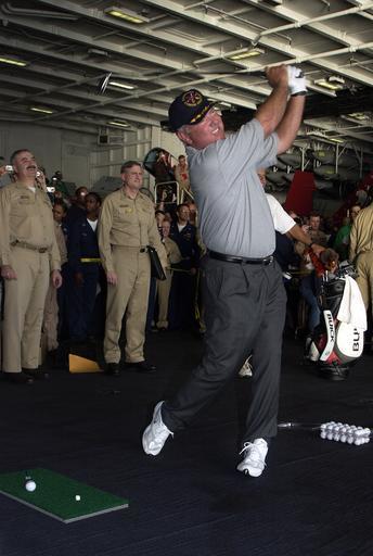 | Keywords: US Navy 040303-N-5319A-007 Sailors watch professional golfer Mark O'Mara hit a few golf balls during a demonstration in the hanger bay of the nuclear powered aircraft carrier USS George Washington (CVN 73).jpg en Arabian Gulf Mar 3 2004 Sailors watch professional golfer Mark O'Mara hit a few golf balls during a demonstration in the hanger bay of the nuclear powered aircraft carrier USS George Washington CVN 73 Tiger Woods accompanied by his fiancé Elin Nordegren PGA player Mark O Meara and caddies Steve Williams and Greg Rita visited the Norfolk Va Based carrier in the Arabian Gulf before participating in the European PGA Tour s Dubai Desert Classic on Thursday The George Washington Carrier Strike Group CSG and Carrier Air Wing Seven CVW-7 are deployed to the Arabian Gulf in support of Operations Iraqi and Enduring Freedom U S Navy photo by Photographer's Mate 1st Class Brien Aho RELEASED 2004-03-03 040303-N-5319A-007 Navy http //www navy mil/view_image asp id 12365 U S Navy photo by Photographer's Mate 1st Class Brien Aho PD-USGov-Military-Navy Aboard USS George Washington CVN-73 Mark O'Meara |