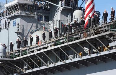 | Keywords: US Navy 040309-N-3236B-006 Sailors man the rails today as the amphibious assault ship USS Peleliu (LHA 5) approaches the pier following a six-and-a-half month deployment in support of the global war on terrorism.jpg en San Diego Mar 9 2004 - Sailors man the rails today as the amphibious assault ship USS Peleliu LHA 5 approaches the pier following a month deployment in support of the global war on terrorism USS Peleliu is one of five San Diego-based ships assigned to Expeditionary Strike Group One ESG-1 ESG-1 consists of Peleliu the amphibious transport dock USS Ogden LPD 5 the guided missile destroyer USS Decatur DDG 73 the guided missile Frigate USS Jarrett FFG 33 and the amphibious dock landing ship USS Germantown LSD 42 ESG-1 is capable of operating in shallow narrow waterways or the open ocean day and night in all weather conditions in support of marine or joint forces operating near-shore or deep inland U S Navy photo by Photographer's Mate 1st Class Ted Banks RELEASED 2004-03-09 040309-N-3236B-006 Navy http //www navy mil/view_image asp id 12557 U S Navy photo by Photographer's Mate 1st Class Ted Banks PD-USGov-Military-Navy Naval ship arrivals to Naval Base San Diego Aboard USS Germantown LSD-42 War on Terrorism Manning the rail in the United States Navy |