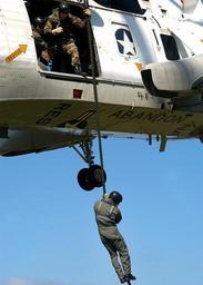 | Keywords: US Navy 040408-N-8921O-012 Aircrew Survival Equipmentman 2nd Class John Mann, of San Diego, Calif., fast ropes out of a UH-3H Sea King helicopter.jpg  en Oak Harbor Wash Apr 08 2004 - Aircrew Survival Equipmentman 2nd Class John Mann of San Diego Calif fast ropes out of a UH-3H Sea King helicopter Petty Officer Mann is assigned to Explosive Ordnance Disposal Mobile Unit Eleven EODMU-11 The unit is conducting fast rope and rappelling exercises to help prepare the team for combat situations U S Navy photo by Photographer's Mate Airman Chris Otsen RELEASED 2004-04-08 040408-N-8921O-012 Navy http //www navy mil/view_image asp id 13172 U S Navy photo by Photographer's Mate Airman Chris Otsen PD-USGov-Military-Navy Naval Air Station Whidbey Island United States Navy Explosive Ordnance Disposal Aircrew Survival Equipmentman Fast roping UH-3H Sea King Explosive Ordnance Disposal Mobile Unit 11 |