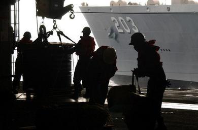 | Keywords: US Navy 040411-N-9851B-009 Sailors aboard the nuclear powered aircraft carrier USS Harry S. Truman (CVN 75) retrieve cargo transferred from the Military Sealift Command (MSC) underway replenishment oiler USNS Laramie (T-AO 203).jpg  en Atlantic Coast Apr 11 2004 - Sailors aboard the nuclear powered aircraft carrier USS Harry S Truman CVN 75 retrieve cargo transferred from the Military Sealift Command MSC underway replenishment oiler USNS Laramie T-AO 203 in the ship's hangar bay during an Underway Replenishment UNREP Truman is currently undergoing a Tailored Ships Training Availability TSTA exercise off the Atlantic Coast U S Navy photo by Photographer's Mate 2nd Class John L Beeman RELEASED 2004-04-11 040411-N-9851B-009 Navy http //www navy mil/view_image asp id 13232 U S Navy photo by Photographer's Mate 2nd Class John L Beeman PD-USGov-Military-Navy Cargo in transfer underway replenishment Aboard USS Harry S Truman CVN-75 Personnel at underway replenishment Aboard USNS Laramie T-AO-203  |