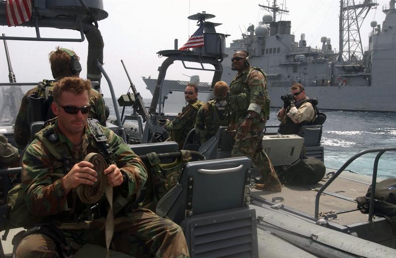 | Keywords: US Navy 040421-N-7586B-027 Sailors assigned to Special Boat Team Twelve (SBT-12) make final preparations to their Rigid Hull Inflatable Boats (RHIB).jpg  en Gulf of Oman Apr 21 2004 - Sailors assigned to Special Boat Team Twelve SBT-12 make final preparations to their Rigid Hull Inflatable Boats RHIB after being lowered to the water from the flight deck of USS Whidbey Island LSD 41 as USS Leyte Gulf CG 55 cruises in the background The amphibious dock landing Ship Whidbey Island and Ticonderoga-class guided missile cruiser Leyte Gulf are participating in Operation Enduring Freedom OEF while deployed to the U S Central Command Area of Operation supporting the Global War on Terrorism U S Navy photo by Photographer s Mate 1st Class Bart Bauer RELEASED 2004-04-21 040421-N-7586B-027 Navy http //www navy mil/view_image asp id 13608 U S Navy photo by Photographer s Mate 1st Class Bart Bauer PD-USGov-Military-Navy Rigid-hulled inflatable boats of US Navy USS Leyte Gulf CG-55 Special Warfare Combatant-craft Crewmen Special Boat Team 12 |